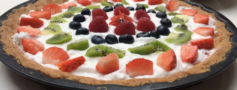 Uzsilda krāsni 180°C. Samaisa kopā visas sausās sastāvdaļas, tad pievieno eļļu, augu pienu un atkal samaisa. Pannu (25cm diametrā) ieziež ar eļlu un ieklāj mīklu vienmērīgā kārtā. Cep 20-25 min. Kad izcepta, ļauj atdzist un sāk dekorēt. Ieklāj pamatnē nelielā kārtiņā ievārījumu pēc izvēles, turku zirņu putukrējumu un dekorē ar ogām.