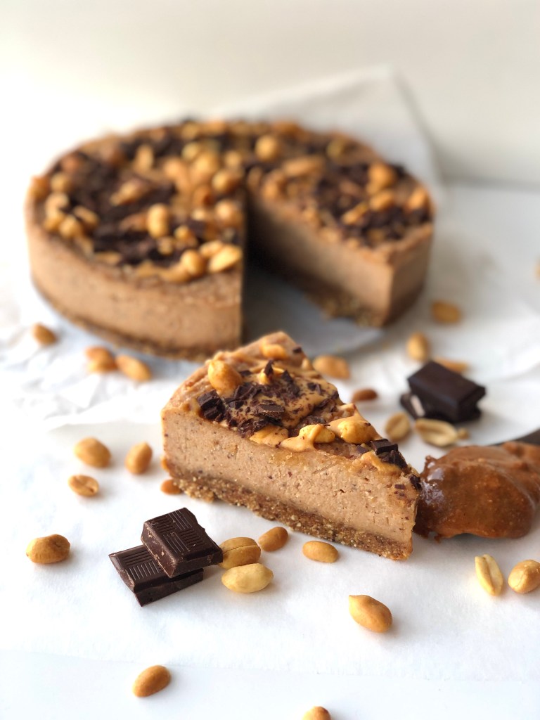 Es jau iepriekš esmu jums parādījusi, kā pagatavot vienkāršu un vegānisku Snickers kūku, bet šoreiz parādīšu tās ‘siera’ kūkas versiju. Ātri un vienkārši pagatavojama, bez glutēna un cepšanas.