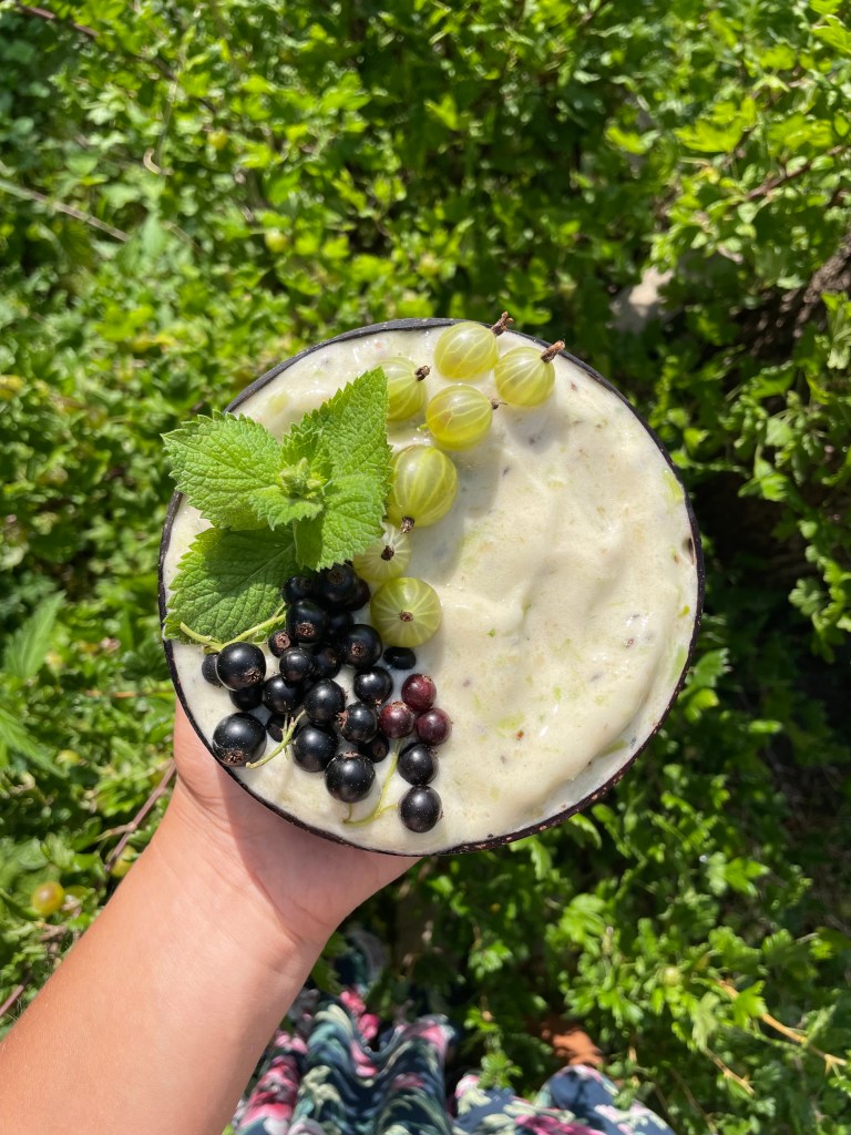 Pagatavošana: Liec visas sastāvdaļas jaudīgā blenderī vai virtuves kombainā un blendē līdz krēmīgs. Pasniedz savā mīļākajā bļodiņā un dekorē ar papildus piparmētru lapiņām, ērkšķogām un upenēm. Lai labi garšo!
