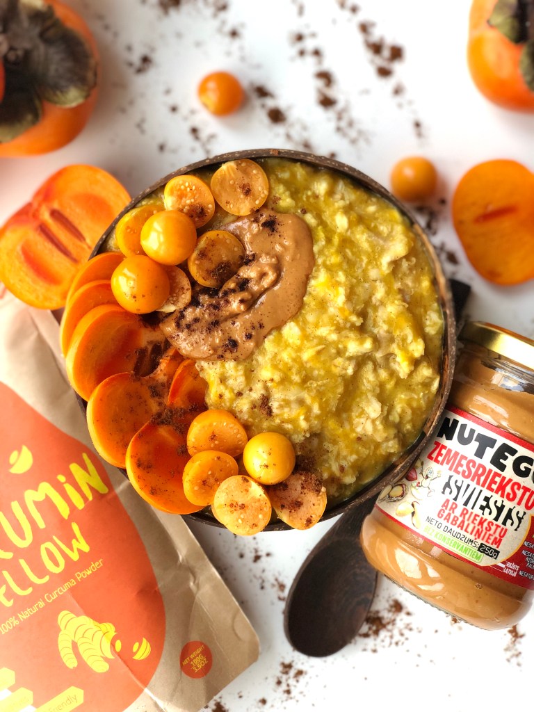 Pagatavošana: Ber katliņā pus glāzi auzu pārslas, pievieno 1 glāzi augu pienu vai ūdeni, šķipsniņu sāls, apmēram 100 g ķirbju biezeni, 1 gabaliņos sagrieztu banānu un 1/2 tējk kurkumu. Vāri pāris minūtes uz lēnas uguns līdz viss šķidrums ir absorbējies un pasniedz ar ievārījumu, zemesriekstu sviestu un ogām vai augļiem pēc izvēles! ⠀